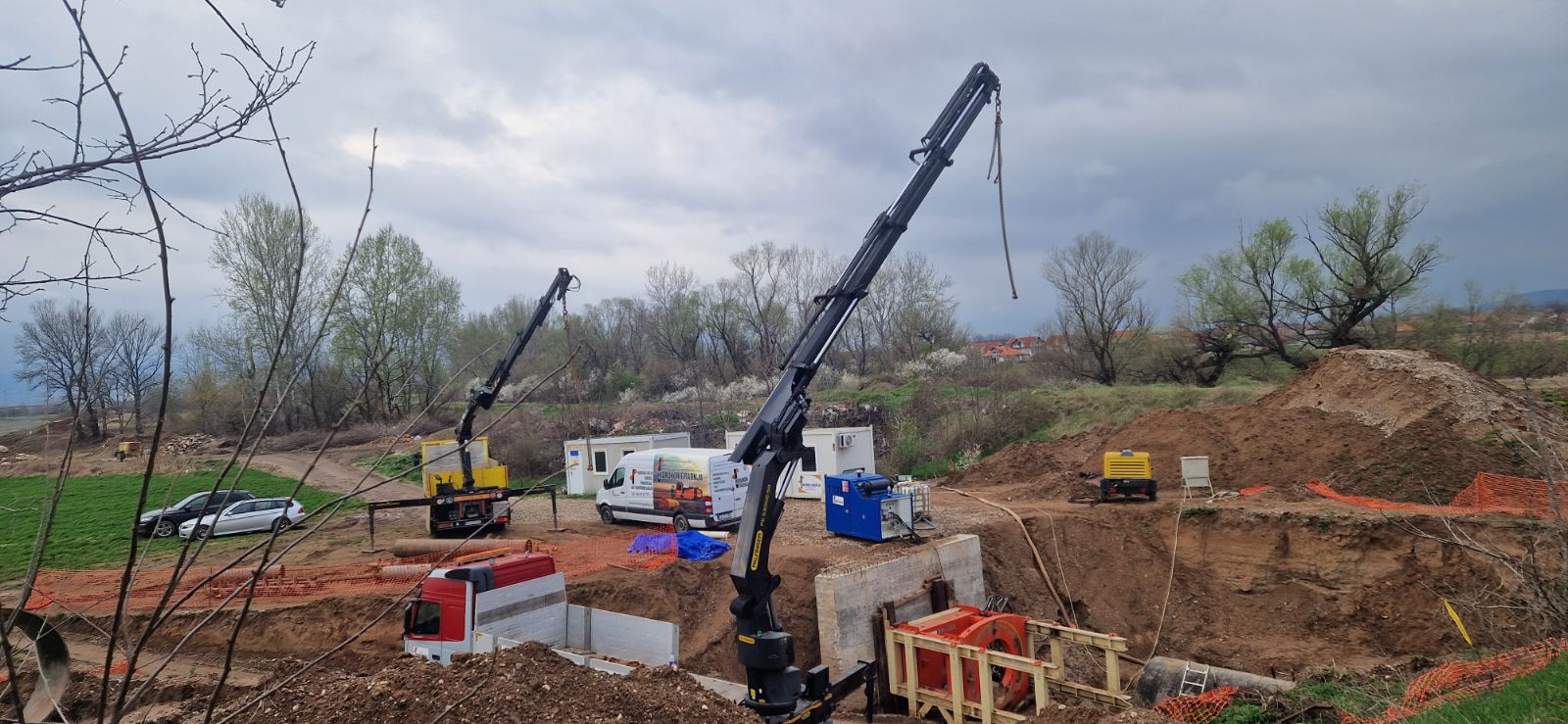 Montiranje mašine za mikrotuneliranje: Delovi mašine su spušteni i montirani u građevinsku jamu pomoću krana.